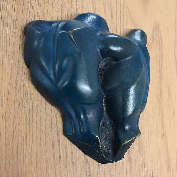 Pour la première coulée j’ai choisi de faire une très belle patine brune mouchetée de noir qui révèle les formes de cette toute petite sculpture, presque un bijou.