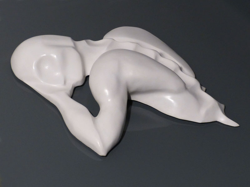 This sculpture, made of resin and porcelain powder, is fixed on a coloured glass panel. A fastening system allows it to be displayed vertically or horizontally.